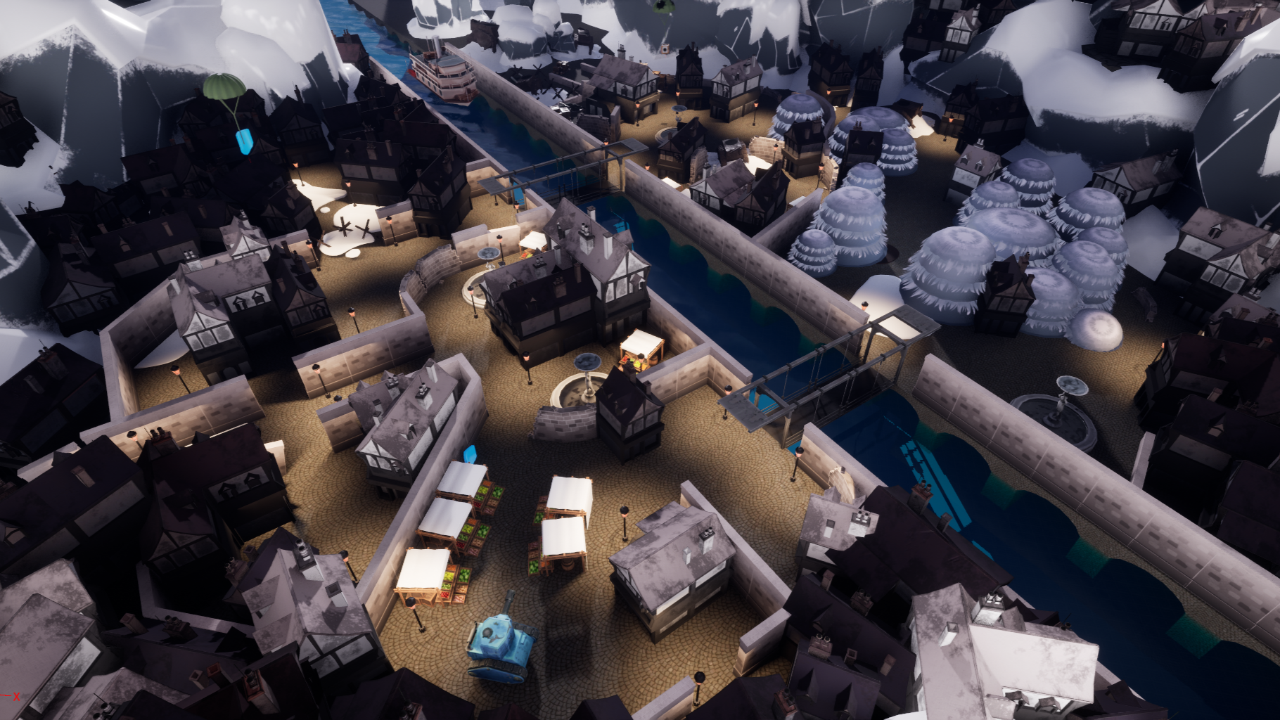 The game features 7 various weapons & power ups help players destroy the map and each other across 6 unique maps. Each map features a unqiue enviromental hazard or event to keep gameplay dynamic & evolving